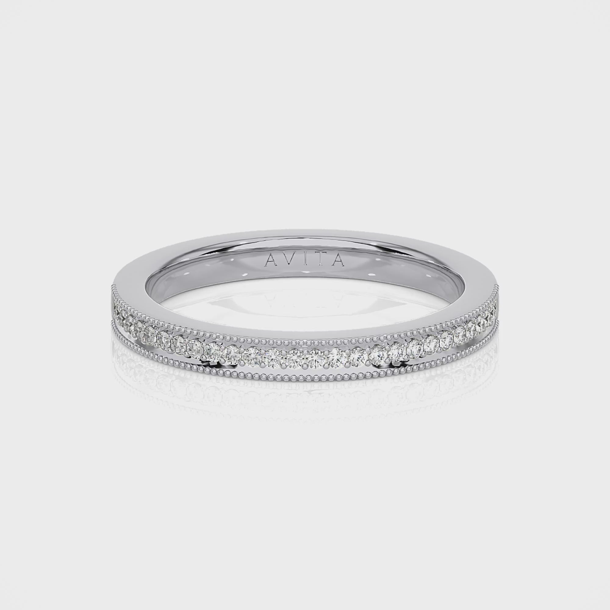 A delicate and stunning choice for any vintage yet modern bride, featuring a stunning channel setting with millgrain detailing and round brilliant-cut diamonds set the entire way round the band. The millgrain detailing adds a touch of elegance to any wedding ensemble. Elevate your wedding day look with this expertly crafted piece.