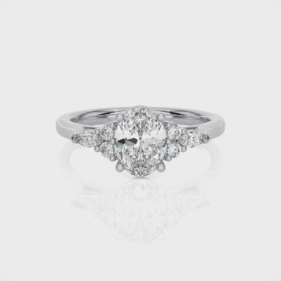 The Florence engagement ring boasts a unique design with an oval centre stone, accompanied by two round diamonds and a marquise diamond to either side. Its stunning trilogy look is sure to captivate and make a lasting impression. Elevate your proposal with this exquisite ring.