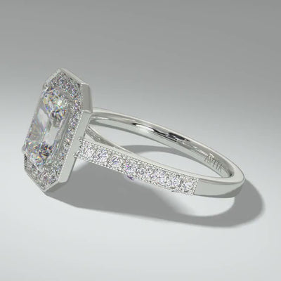 If you are looking for a low profile halo design then the "Ivy" engagement ring could be for you. Set with an emerald brilliant diamond in the centre, with the halo decorated with small round diamonds and then beautifully finished with milgraining along the edge.