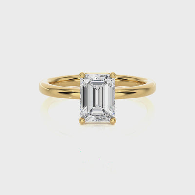 A beautiful Emerald cut contemporary diamond engagement ring that sits the diamond proudly on top of the band. The rounded petit band makes the ring really comfortable to wear. This ring will look great with any size diamond and various shapes.