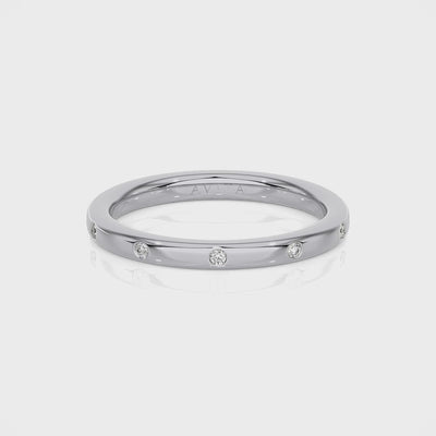 Experience elegance and charm with Odette, a classic court wedding ring adorned with small, evenly-dotted diamonds for a subtle sparkle. Enhance your special day with this stunning addition.