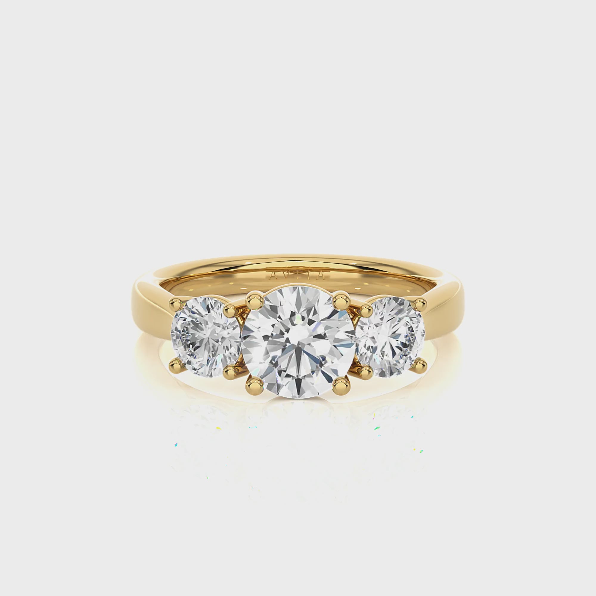 The Roma Round Lab offers a classic design with its large round centre stone elegantly supported by two smaller diamonds of the same cut. Crafted with the highest quality materials, the carefully selected stones are sure to add a touch of elegance and sparkle. Providing a stunning symmetrical look this ring is ideal for those seeking a classic and timeless piece.