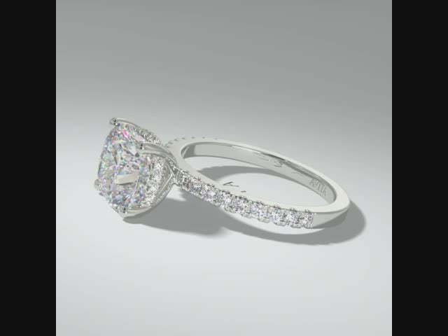 This is a stunning cushion cut lab diamond engagement ring with lab diamonds set along the shoulder and with lab diamonds set on the side of the setting. Often referred to as a Hidden Halo.
