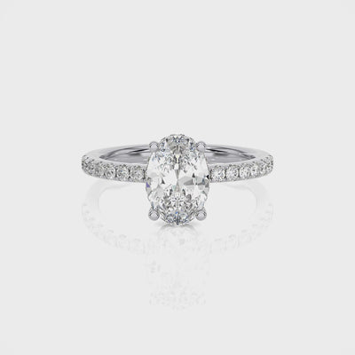 This is a stunning Oval lab diamond engagement ring with lab diamonds set along the shoulder and with lab diamonds set on the side of the setting. Often referred to as a Hidden Halo.