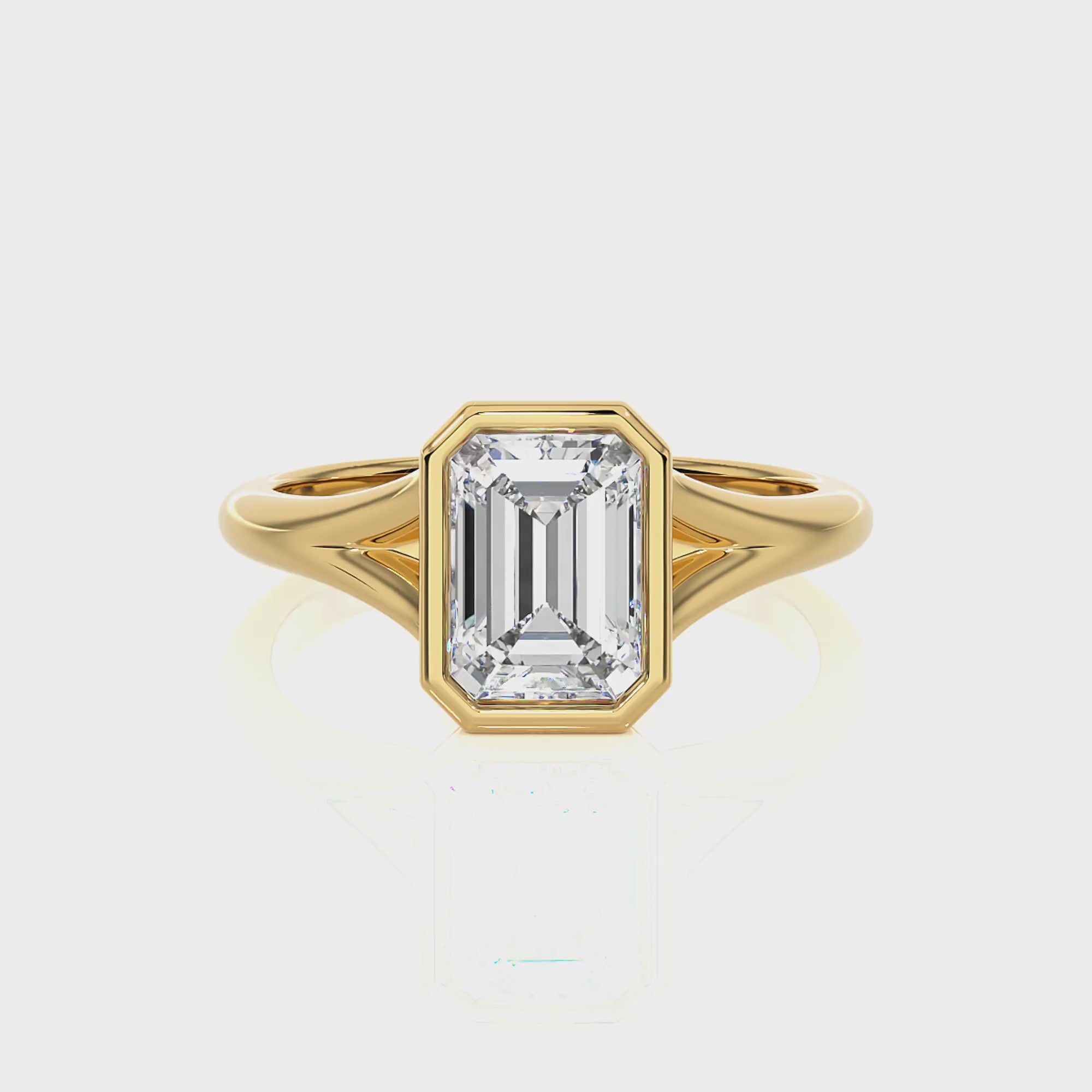 Expertly crafted with a unique split shank design, the Bezel Emerald ring showcases a step cut emerald lab diamond, bezel set allowing for more of your chosen metal to be on display. This modern solitaire engagement ring is the perfect choice for those looking for a contemporary and sleek option.