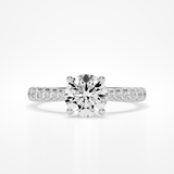 This lovely ring is a stunning diamond shoulder engagement ring set with a round brilliant cut diamond in a four-prong setting. What sets this ring apart is how the band tapers in towards the diamond.