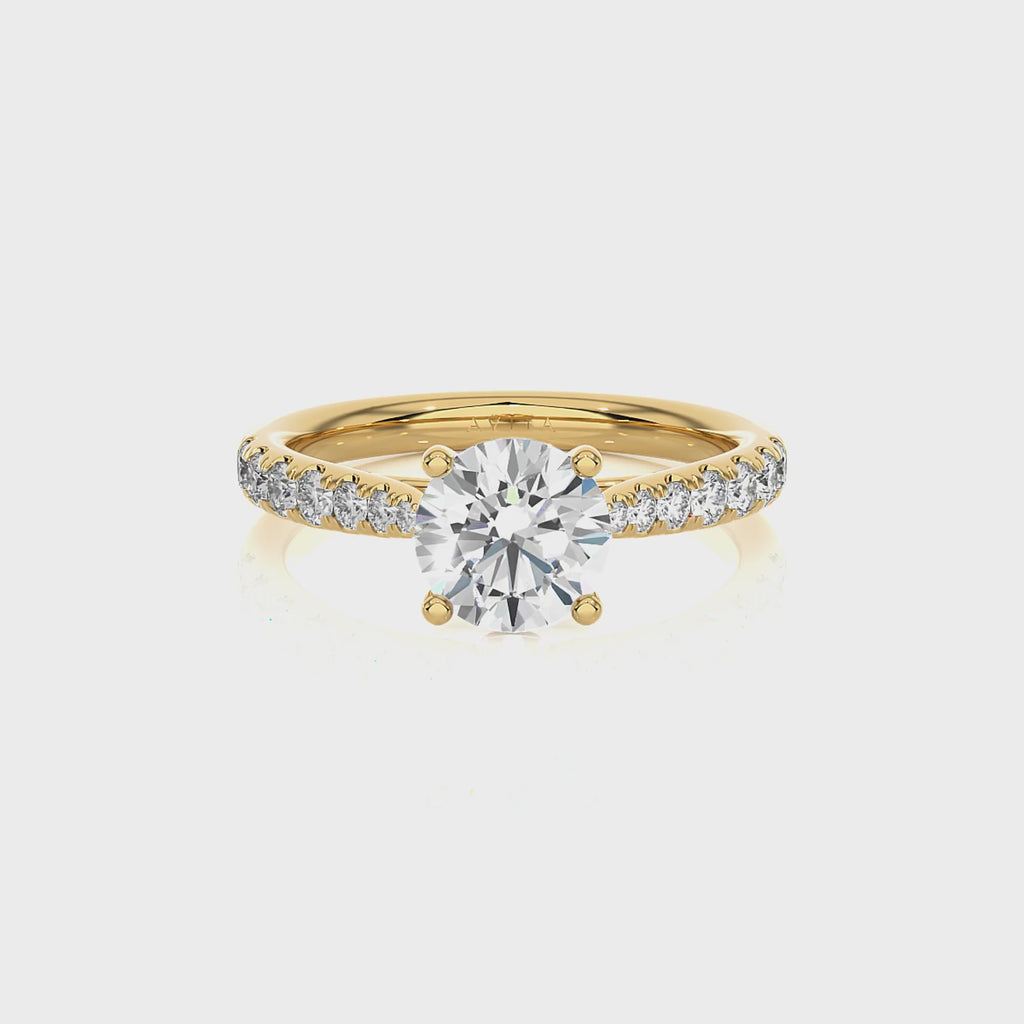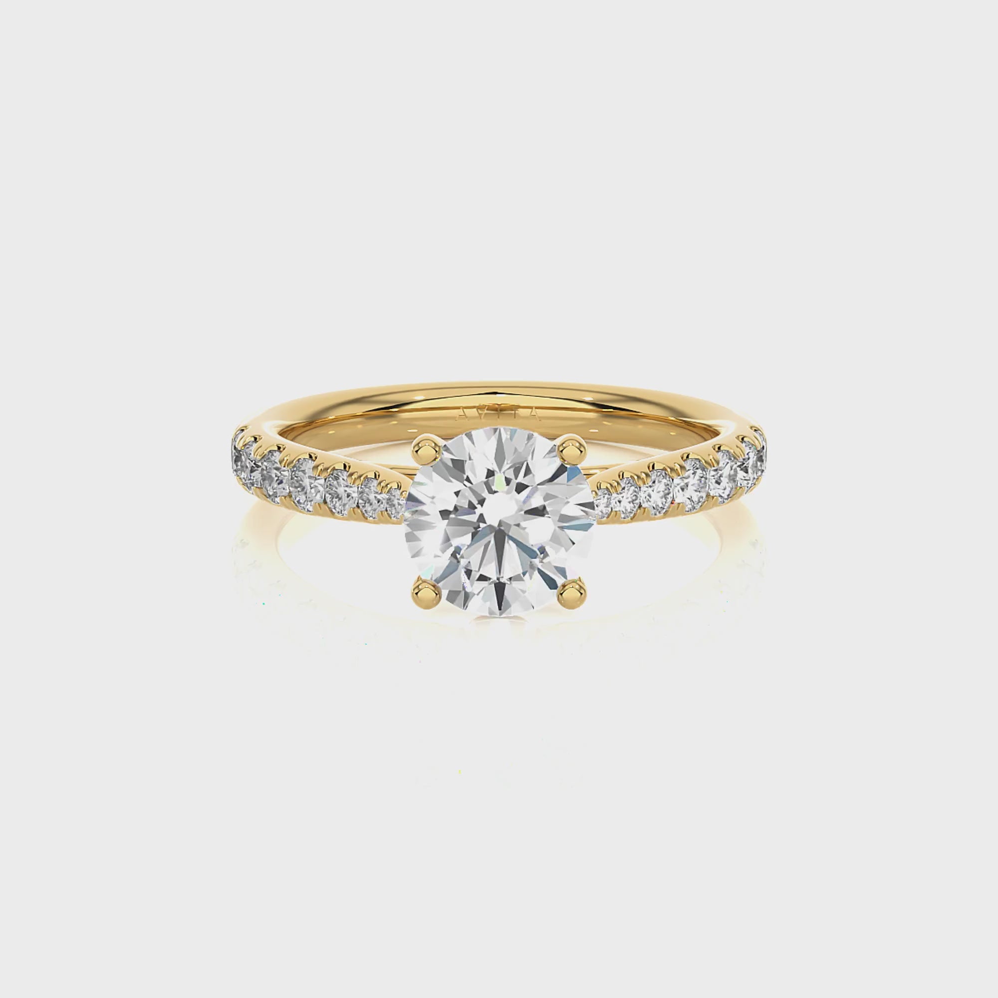 This lovely ring is a stunning diamond shoulder engagement ring set with a round brilliant cut diamond in a four-prong setting. What sets this ring apart is how the band tapers in towards the diamond.
