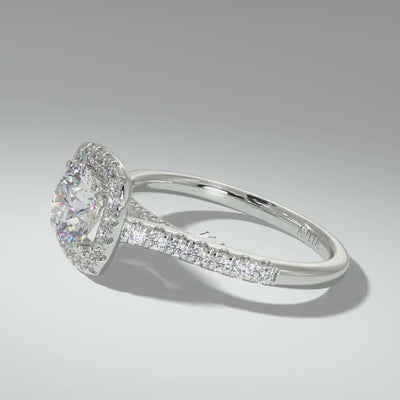 The 'Talina' is a ring that oozes contemporary design excellence combined with all that is admirable in a vintage styled piece. The round centre stone demands the attention it deserves and is expertly surrounded by a cushion border of smaller diamonds. With encrusted shoulders and an under claw diamond feature, this is an outstanding jewellery piece. The 'Talina' comes in a choice of precious metals and diamond sizes for true personalisation.