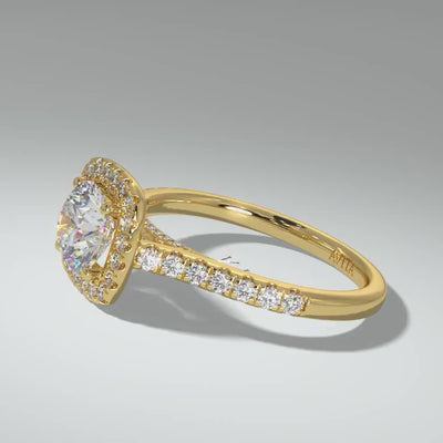 The 'Talina' is a ring that oozes contemporary design excellence combined with all that is admirable in a vintage styled piece. The round centre stone demands the attention it deserves and is expertly surrounded by a cushion border of smaller diamonds. With encrusted shoulders and an under claw diamond feature, this is an outstanding jewellery piece. The 'Talina' comes in a choice of precious metals and diamond sizes for true personalisation.