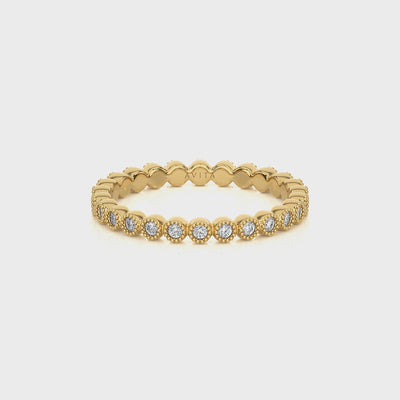 This diamond wedding band features millgrain detailing around repeating round brilliant cut diamonds, creating a stunning and unique design. This band can be worn standalone or stacked as a wedding ring or eternity band. Elevate your style and add a touch of elegance to any ensemble with this beautiful piece.